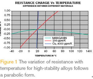 圖1 是錳鎳銅合金電阻的典型溫度特性曲線,溫度系數(shù)TCR單位為ppm/K,在20或25°C 時(shí),TCR=[R(T)-R(T0)]/R(T0) ×(T-T0),對于溫度系數(shù)的定義,制造商標(biāo)明溫度的上限是必要的,舉例說明在+20 -+60°C的溫度范圍內(nèi),測量系統(tǒng)經(jīng)常選用TCR為幾百個(gè)ppm/K 的低阻值的厚膜電阻器,圖1中紅色曲線表示TCR 為200 ppm/K的電阻器的溫度特性,即使在如此小的范圍內(nèi),+50°C的溫度變化就足以導(dǎo)致阻值變化超過1%,這樣的電阻是不能用于精確電流測量的,有些測量設(shè)備制造商甚至使用PCB走線的銅膜作為電流取樣電阻,銅的TCR是4000 ppm/K(or 0.4%/K),2.5°C的溫度變化就足以造成1%的誤差。