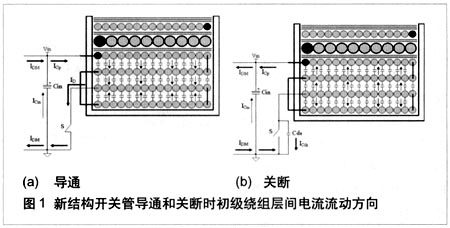 如果對變壓器的結(jié)構(gòu)進(jìn)行改進(jìn),如圖1所示,通過補(bǔ)償?shù)姆绞娇梢詼p小差模電流。注意:初級繞組的熱點(diǎn)應(yīng)該埋在變壓器的最內(nèi)層,外層的繞組起到屏蔽的作用。同樣,基于電壓的變化方向,可以得到初級繞組層間電容的電流方向,由圖1所示可以看到,部分層間電流由于方向相反可以相互抵消,從而得到補(bǔ)償。