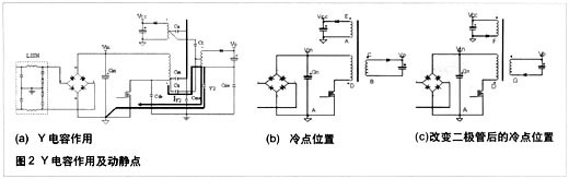 共模電流在輸入及輸出線與大地間流動,主要有下面幾部分:通過MOSFET源級到大地的電容Cde。如果改進(jìn)IC的設(shè)計(jì),如對于單芯片電源芯片,將MOSFET源極連接到芯片基極,用于散熱,而不是用漏極進(jìn)行散熱,這樣可以減小漏極對大地的寄生電容。PCB布線時減小漏極區(qū)銅皮的面積可減小漏極對大地的寄生電容,但要注意保證芯片的溫度滿足設(shè)計(jì)的要求;通過Cm 和Cme產(chǎn)生共模電流;通過Ca和 Cme產(chǎn)生共模電流;通過Ct和Coe產(chǎn)生共模電流;通過Cs和Coe產(chǎn)生共模電流,這部分在共模電流中占主導(dǎo)作用。減小漏極電壓的變化幅值及變化率可減小共模電流,如降低反射電壓,加大漏-源極電容,但這樣會使MOSFET承受大的電流應(yīng)力,其溫度將增加,同時加大漏-源極電容,產(chǎn)生更強(qiáng)的磁場。如果系統(tǒng)加了Y電容,如圖2所示,通過Cs的大部分共模電流被Y 電容旁路,返回到初級的地,因?yàn)閅電容的值大于Coe。Y電容必須直接并用盡量短的直線連接到初級和次級的冷點(diǎn)。如果導(dǎo)通時MOSFET的dV/dt大于關(guān)斷時的值,Y電容則連接到初級的地,反之連接到Vin。