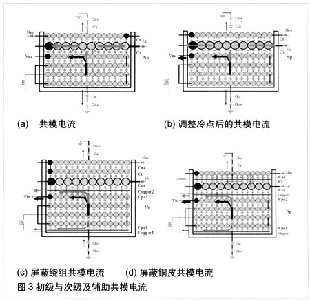 如果在內(nèi)層及初級、次級繞組間放置銅皮,銅皮的寬度小于或等于初級繞組的寬度,銅皮的中點(diǎn)由導(dǎo)線連到冷點(diǎn),如圖3(c)所示,由于銅皮為冷點(diǎn),與其接觸的繞組和銅皮間電壓的擺率降低,從而減小共模電流,同時將共模電流由銅皮旁路引入到冷點(diǎn)。注意銅皮的搭接處不能短路,用絕緣膠帶隔開,內(nèi)外層銅皮的方向要一致。輔助繞組和次級繞組的共模電流可以由以下方法補(bǔ)償:① 加輔助屏蔽繞組:輔助屏蔽繞組繞制方向與次級繞組保持一致,輔助屏蔽繞組與次級繞組的同名端連接到一起,并連接到冷點(diǎn),輔助屏蔽繞組的另一端浮空。由于它們的電壓變化的方向相同,所以兩者間沒有電流流動。②加外層的輔助屏蔽銅皮:輔助屏蔽銅皮的中點(diǎn)連接到輔助繞組的中點(diǎn)。同樣,基于電壓的變化方向分析電流的方向,可以看到,兩者之間的電流形成環(huán)流,相互補(bǔ)償?shù)窒瑥亩档凸材k娏鳌?br />