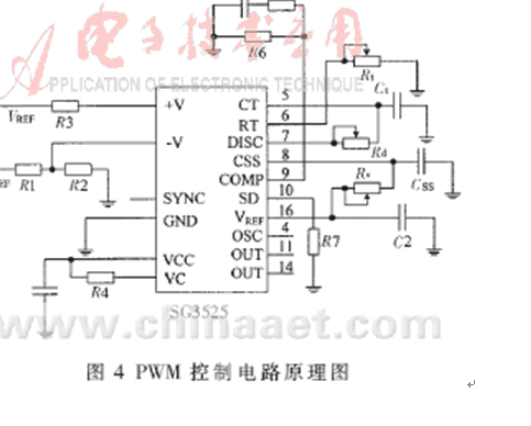 在以IGBT設(shè)計(jì)的逆變電源中,PWM控制電路是極其重要的組成部分,SG3525脈寬調(diào)制型控制器作為SG3524的改進(jìn)型,更適合于開關(guān)器件的雙端DC-DC變換器,它的外圍電路原理圖如圖4所示,輸出波形如圖5所示。