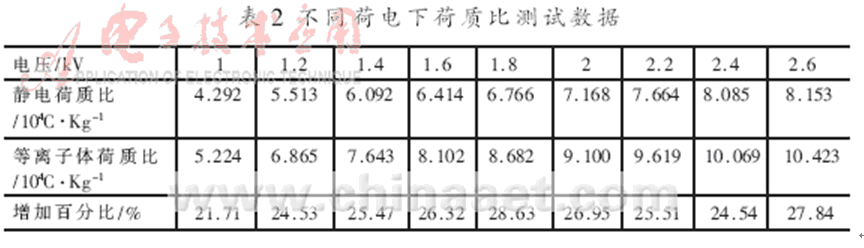 荷質(zhì)比是衡量霧滴荷電性能的重要指標(biāo),荷質(zhì)比越大,霧滴的荷電性能及充電效果越好,通過實(shí)驗(yàn)手段可對(duì)霧滴荷電情況進(jìn)行測(cè)量。不同荷電情況下荷質(zhì)比測(cè)試數(shù)據(jù)如表2所示。