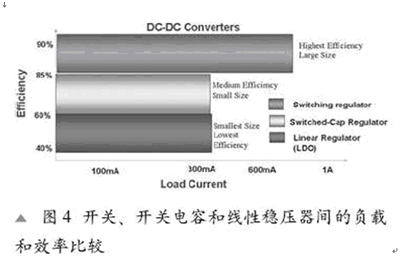 隨著VIN的增長(zhǎng),由轉(zhuǎn)換器產(chǎn)生的VIN和VOUT 間的增量增長(zhǎng)引起功率消耗的增長(zhǎng)和效率的下降。解決這個(gè)問(wèn)題的一個(gè)方式是轉(zhuǎn)變成一個(gè)更高的效率增益,就像給汽車(chē)替換齒輪一樣。圖2顯示了一個(gè)開(kāi)關(guān)電容器降壓穩(wěn)壓器,一個(gè)LDO及一個(gè)開(kāi)關(guān)電容器的效率曲線。開(kāi)關(guān)電容器具有一個(gè)模擬增益控制和增益變化以保持一個(gè)給定負(fù)載效率的持續(xù)性。開(kāi)關(guān)電容器并具有離散增益步驟,由VOUT/(增益 *VIN)與離散增益來(lái)決定效率的高低。一個(gè)LDO僅有1的增益及三者中最低的效率。開(kāi)關(guān)電容器(SC)穩(wěn)壓器則有三個(gè)不同的電壓增益(2/3,1/2和1/3)。我們可以看到,開(kāi)關(guān)電容穩(wěn)壓器隨著VIN 的增長(zhǎng),電壓增益從2/3轉(zhuǎn)到1/2以及從1/2到1/3,因此整個(gè)負(fù)載范圍的效率達(dá)到最大化。這就帶來(lái)了在Li-ion 范圍上(3.4V到3.8V)80%的效率。在相同應(yīng)用中的一個(gè)LDO僅能達(dá)到50%的效率。根據(jù)電感器種類(lèi),一個(gè)典型的開(kāi)關(guān)穩(wěn)壓器大約具有88-90%的效率。