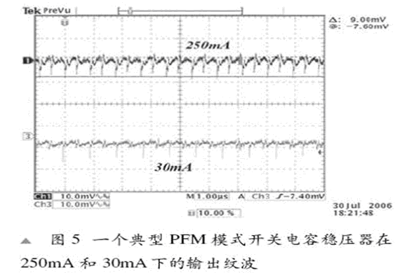 在PFM類(lèi)系統(tǒng)中,可以感應(yīng)到輸出電壓,當(dāng)這個(gè)電壓高于一個(gè)指定值時(shí),穩(wěn)壓器就會(huì)關(guān)閉,等到輸出電壓降到所需值以下時(shí)再重新開(kāi)啟。使用PFM控制模式的缺點(diǎn)是工作頻率取于VIN 和 ILOAD ,因此變化不定。負(fù)載越高、工作頻率就越接近指定頻率。這個(gè)操作范圍上的頻率變化在一些便攜式應(yīng)用中可能不大合適。輸入電壓紋波也取決于VIN 和 ILOAD。圖5顯示了250mA 和 30mA 負(fù)載的輸出紋波。10mF COUT 的輸出紋波將為50mV,我們可以看到250mA負(fù)載的紋波頻率高于10mA負(fù)載的紋波頻率。