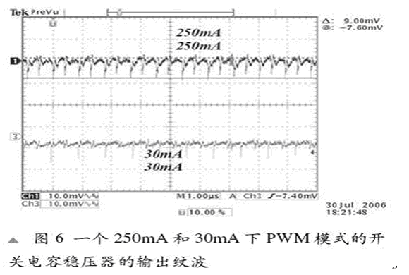 比較新的PWM調(diào)控模式處理了PFM架構(gòu)中的各種頻率和高輸出紋波。大多數(shù)的新型開(kāi)關(guān)電容穩(wěn)壓器都采用PWM調(diào)制模式。在這種模式下,功率FET的電阻根據(jù)VOUT 和 ILOAD進(jìn)行控制。這樣做,我們就真正控制了快速電容器(CFLY)所提供的充電量。這也被稱為預(yù)調(diào)制。在這種模式下,操作頻率和工作周期都是固定的。一個(gè)PWM架構(gòu)的例子是LM2771,圖6顯示出它的輸出紋波。它處于一個(gè)帶有4.7mF COUT 的8mV -10mV的順序中。我們可以看到在ILOAD變化的情況下紋波可以持續(xù)。一個(gè)9mV的紋波輸出可以與在感應(yīng)開(kāi)關(guān)穩(wěn)壓器中的紋波相媲美。