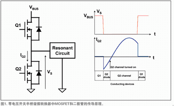 圖1所示為零電壓開關(guān)半橋諧振轉(zhuǎn)換器中MOSFET和體二極管的傳導(dǎo)原理。在這種轉(zhuǎn)換器中,電流波形滯后于電壓。假設(shè)Q1開通,Q2關(guān)斷。Q1傳導(dǎo)諧振電流。在一定時間之后,由控制環(huán)路決定,Q1關(guān)斷。這時,諧振電流流經(jīng)Q2的體二極管。在負(fù)電流期間的某一時刻,Q2導(dǎo)通,減小傳導(dǎo)損耗。當(dāng)其上電壓為體二極管的正向電壓時(遠(yuǎn)小于總線電壓),Q2導(dǎo)通。這就是有效的零電壓開關(guān)。Q2中的諧振電流反向。在一定時間之后,同樣由控制環(huán)路決定,Q2關(guān)斷。當(dāng)大電流流過,且Q2的電壓擺幅接近總線電壓時,這種關(guān)斷順序并非低損耗。