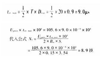 計算原副邊繞組匝數(shù):按輸入電壓最低及輸出滿載的情況(此時占空比最大)來計算原副邊繞組匝數(shù),已知Umin=176V經(jīng)整流濾波后直流輸入電壓Udmin=1.2×176=211.2V。