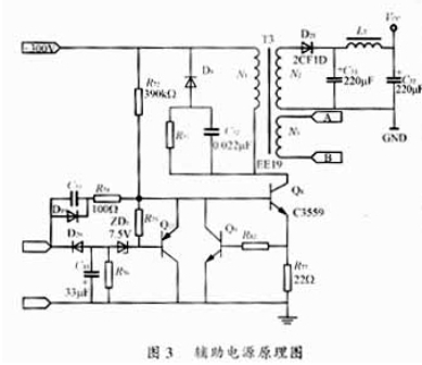 輔助電源采用RCC變換器(RingingChokeConverter),見圖3。其輸入電壓為交流220V整流濾波電壓,輸出直流電壓為12.5V,輸出直流電流為0.5A。電路中Q8和變壓器初級繞組線圈N1與反饋繞組線圈N3構(gòu)成自激振蕩。R72為啟動電阻。Q9、R77構(gòu)成輔助電源初級過流保護(hù)。D20、C81、ZD1、Q11、R75、R76構(gòu)成電壓檢測與穩(wěn)壓電路,控制Q8的基極電流的直流分量,從而保持輸出電壓恒定,變壓器采用EE19、LP3材質(zhì)構(gòu)成。初級180匝,反饋繞組5.5匝,次級11匝,初級電感量是2.6mH,磁芯中間留有間隙0.4mm。
