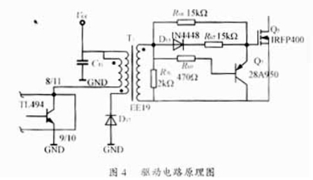 驅(qū)動電路如圖4所示。TL494輸出50kHz的脈沖信號,通過高頻脈沖變壓器耦合去驅(qū)動功率MOS管。次級脈沖電壓為正時,MOS管導(dǎo)通,在此期間Q7截止,由其構(gòu)成的泄放電路不工作。當(dāng)次級脈沖電壓為零時,則Q7導(dǎo)通,快速泄放MOS管柵級電荷,加速M(fèi)OS管截止。R70是用于抑制驅(qū)動脈沖的尖峰,R68、D15、R67可以加速驅(qū)動并防止驅(qū)動脈沖產(chǎn)生振蕩。D17和與它相連的脈沖變壓器繞組共同構(gòu)成去磁電路。