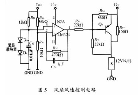風(fēng)扇風(fēng)速控制電路見圖5。利用二極管正向管壓降隨溫度升高而呈下降趨勢的特性,將D9、D10做為散熱器溫度采樣器件。方法是將D9、D10兩二極管緊靠在散熱器上,當(dāng)散熱器隨輸出功率加大而溫度升高時,運(yùn)放N2A正相輸入端電平降低,輸出低電平使三極管Q3開始導(dǎo)通,風(fēng)機(jī)上電壓升高,轉(zhuǎn)速升高,最終到達(dá)最高轉(zhuǎn)速。當(dāng)負(fù)載較輕,使散熱器溫度低于50℃時,N2A輸出高電平,Q3不導(dǎo)通,輔助電源12.5V經(jīng)電阻R57降壓給風(fēng)機(jī)供電,風(fēng)機(jī)處于低速、低噪聲運(yùn)行狀態(tài)。此電路可以提高風(fēng)機(jī)工作壽命,增加電路可靠性,亦可在小負(fù)載情況下,減少風(fēng)機(jī)帶來的噪聲。