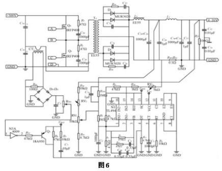 控制電路采用通用脈寬調(diào)制器TL494,具有通用性和成本低等優(yōu)點,見圖6。輸出電壓經(jīng)R40、RV2、RV1、R41進(jìn)行分壓采樣,經(jīng)R5阻抗匹配后送到TL494腳1。RV1裝在電源前面板上用于實現(xiàn)輸出電壓的調(diào)節(jié)。R103和C14將輸出電感L1前信號采樣,經(jīng)R5送到TL494腳1,用于提高電源穩(wěn)定度,消除L1對環(huán)路穩(wěn)定性影響。