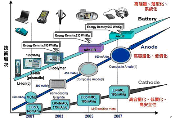 鋰二次電池雖然已廣泛使用于3C產(chǎn)品上,然而隨著筆記型電腦使用1GHz CPU而增加耗電量,以及LCD螢?zāi)怀叽缂哟蟆⒔馕龆忍岣?、使用高容量硬碟及DVD-ROM等趨勢(shì),未來(lái)筆記型電腦整體功率消耗明顯提高,因此對(duì)鋰電池主要的技術(shù)提升需求,包括提升電池能量密度、降低重量與智慧型電源管理。未來(lái)行動(dòng)電話從2G提升至3G時(shí),不論是GSM、WCDMA等系統(tǒng),所需要的電池能量密度都需要明顯的增加。目前薄型鋰電池系統(tǒng)的重量能量密度雖有顯著的提升,但主要是罐體外殼的輕量化,在電極材料的性能提升上,進(jìn)展較少。針對(duì)3G所強(qiáng)調(diào)的高體積能量密度>420 Wh/L要求,目前薄型鋰電池的體積能量密度(340~360 Wh/L)仍無(wú)法符合其規(guī)格目標(biāo)。未來(lái)各種多功能的手錶(Multifunctional Watch),將具有Phone、DSC、MP3等功能,此時(shí)對(duì)能量密度高且薄型化鋰電池的需求更加迫切,另一方面3G行動(dòng)電話與結(jié)合電腦、PDA、行動(dòng)電話等功能的行動(dòng)資訊與通訊終端產(chǎn)品(Mobile IA),將大量地被使用,對(duì)具有高能量密度的鋰電池同樣迫切需求,如(圖二)。因此開(kāi)發(fā)高容量及高功率的納米級(jí)鋰電池材料,并應(yīng)用于新世代的納米鋰電池上,是全世界鋰電池業(yè)者目前最重要需突破的目標(biāo)。