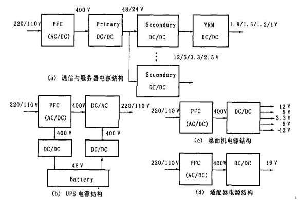 圖1(c)是桌面機(jī)(例如個(gè)人電腦)的電源結(jié)構(gòu)。先由PFC電路將市電變換成400V 的直流電壓,再經(jīng)過一個(gè)多路輸出的DC/DC 變換成多路的較低的直流電壓給不同負(fù)載供電。 圖1(d)是筆記本電腦適配器的電路結(jié)構(gòu)。 首先由PFC 將市電變換成400V的直流電壓,然后經(jīng)過一個(gè)DC/DC變換器降壓至19V(典型值)給負(fù)載供電。