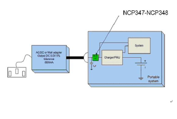 OVLO所定的電平必須高于AC-DC的最大輸出工作電壓并低于系統(tǒng)首個元件的最大額定電壓。圖1所示為一個基于全集成OVP器件的典型便攜式設(shè)備的結(jié)構(gòu)(此處的OVP采用的是NCP347MTAE)。