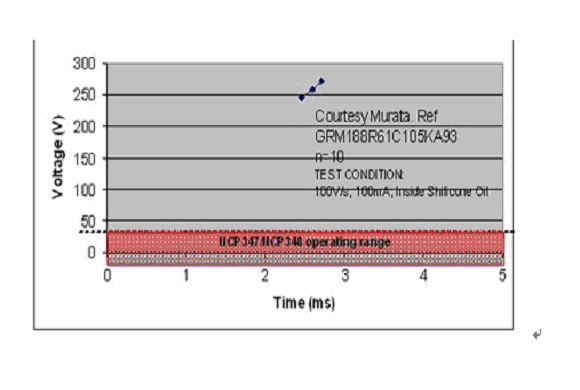 首先要檢查的是該電容的直流偏置曲線,以保證其工作時所能承受的電壓高于UVLO到 OVLO這個電壓范圍。例如,假設(shè)保護器件前方需要一個1µF的陶瓷電容。