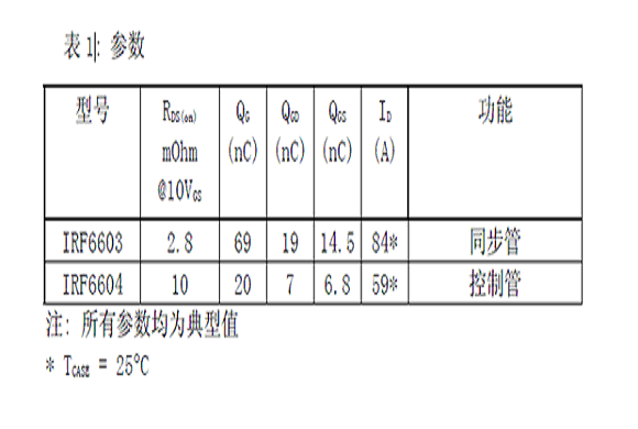 此設(shè)計(jì)可以高效輸出超過100A(>25A/相)的電流而面積只有95mm×31mm(3.8inch X 1.25inch )。每項(xiàng)均使用一個控制管和一個同步管的DirectFET MOSFET。用作控制管和同步管的30V DirectFET的規(guī)格見表1。請注意它們高的載流能力省去了器件并聯(lián)的需要。