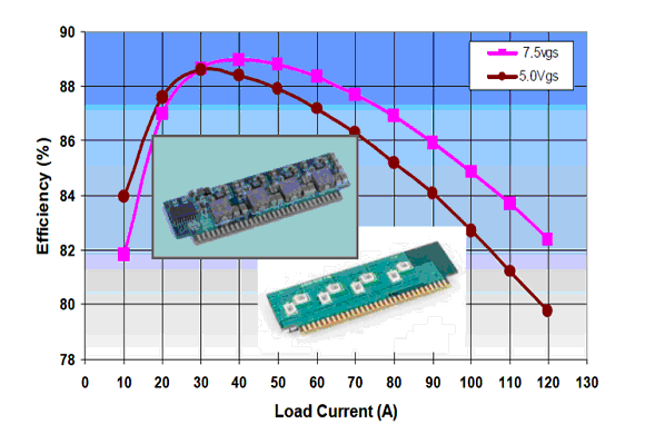 VRM線路板被重新設(shè)計(jì),用4Oz厚覆銅,進(jìn)一步減小PCB走線電阻,改善熱性能。圖2所示為這款4Oz厚覆銅板的VRM,在500KHz工作頻率,12V輸入電壓,1.7V輸出電壓,600LFM風(fēng)冷的條件下的效率曲線。在一個很寬的負(fù)載電流范圍內(nèi),7.5V柵驅(qū)動電壓表現(xiàn)出更高的效率。此款VRM在最大負(fù)載電流120A時,效率達(dá)到82%。