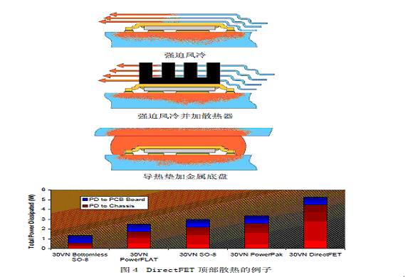 DirectFET封裝的頂部金屬漏極連接為芯片的結(jié)和頂部封裝之間提供了一條較低的熱阻抗路徑使結(jié)到殼的熱阻只有3°C/W 。這就使得器件的散熱方法與以往有很大不同,可以用強(qiáng)迫風(fēng)冷或?qū)岬奶畛浣橘|(zhì)將熱傳到一個(gè)適當(dāng)接地的散熱器上。圖4舉例說明了這些概念。