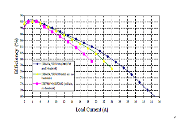 在一個(gè)12V輸入,1.3V輸出,工作頻率300kHZ的同步降壓變換器中,我們將IRF6603/IRF6604和IRF7822/IRF7811W這兩對管子做以比較,它們使用的硅片技術(shù)是相同的。負(fù)載電流增加時(shí),此變換器電路板的溫度不得超過105°C。當(dāng)電流達(dá)到18A時(shí),這是SO8封裝在無冷卻氣流的條件下能夠承受的大電流,IRF6603的結(jié)溫要低50°C。比較DirectFET和SO-8在靜止空氣無散熱器條件下的效率曲線,在18A時(shí)前者的效率要高出3%。