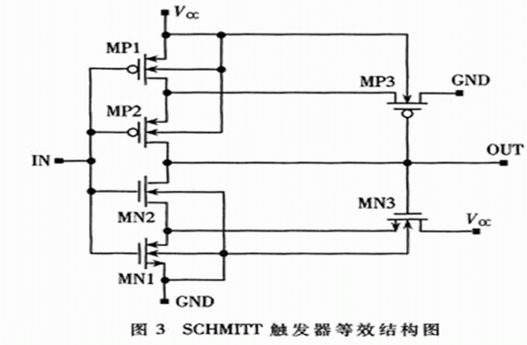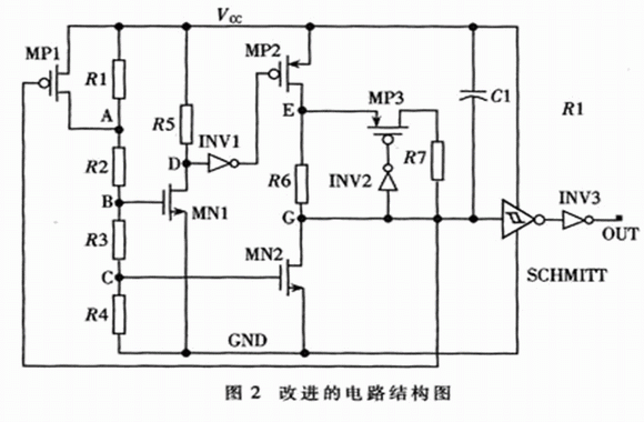 改進(jìn)的電路如圖2所示,電路結(jié)構(gòu)由采樣、先導(dǎo)控制、比較器、遲滯反饋回路、加速響應(yīng)電路、緩沖器六部分構(gòu)成。電阻R1、R2、R3、R4構(gòu)成分壓電阻網(wǎng)絡(luò)實(shí)現(xiàn)對Vcc的采樣;MNl、R5、INVl組成先導(dǎo)控制電路,實(shí)現(xiàn)對比較器灌電流的控制;MN2、R6、MP2組成比較器,實(shí)現(xiàn)采樣電壓與MN2的VTH比較;MP1構(gòu)成正反饋回路,可實(shí)現(xiàn)Vcc的遲滯功能;INV2、MP3、R7構(gòu)成正反饋回路,可加速比較器的翻轉(zhuǎn),從而提高電路的響應(yīng)速度;SCHMITT觸發(fā)器和INV3是緩沖電路,對比較器的輸出波形進(jìn)行緩沖和整形,SCHMITT觸發(fā)器的結(jié)構(gòu)如圖3所示,其工作原理詳見參考文獻(xiàn)[3];另外,電容C1起濾波和儲能作用。