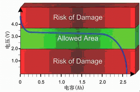 一旦電壓超出允許范圍,鋰電池很容易被損壞(見圖1)。如果超出電壓的上限和下限(例如,nanophosphate鋰電池的電壓上限和下限分別為3.6V和2V),電池就可能會受到不可逆的損壞,至少也會增加電池的自放電率。在相當寬的荷電狀態(tài)范圍內(nèi),輸出電壓可以保持穩(wěn)定,因此正常情況下超出安全范圍的可能性比較小。但是,在接近安全范圍上限和下限的區(qū)域,變化曲線非常陡峭。作為預防措施,仔細監(jiān)測電壓水平非常必要。