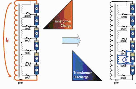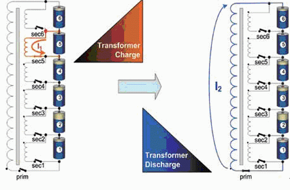 閉合主繞組開關(guān),電池組向變壓器充電。然后斷開主繞組開關(guān),閉合相應的次繞組開關(guān)(本例中為2號次繞組開關(guān)),變壓器儲存的能量轉(zhuǎn)移到指定的電池上。