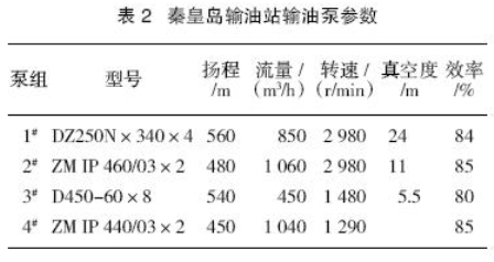 秦皇島輸油站輸油設(shè)備如表2、表3所列。秦皇島輸油站配備4臺輸油泵機組,并聯(lián)方式,直接抽10萬m3油罐外輸,且只能一臺泵機組運行。其中1#泵機組配有液力耦合器調(diào)速裝置,其它3臺均無調(diào)速裝置。冀東原油混入后,出現(xiàn)1#、2#、4#泵機組配置明顯偏大,而3#泵機組配置又有所偏低的狀況,致使輸油站外輸量降低。目前運行中以帶液力耦合器的1#輸油泵機作為主力,該泵機組為上世紀(jì)90年代初期國產(chǎn)產(chǎn)品,效率低,故障率高;而于2003 年與2004年相繼更換的2#、4#泵機組(進(jìn)口設(shè)備)因揚程、排量過大,目前基本處于閑置狀態(tài)。