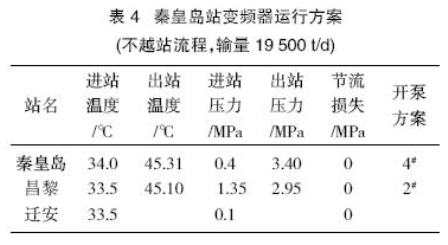 秦皇島站運行4#輸油泵節(jié)流損失0.80 MPa,運行2#輸油泵節(jié)流損失1.2 MPa,浪費很多電能,并且運行中這兩臺泵的震動很大。綜合考慮(冀東油田來油量逐年遞增,秦皇島外輸量逐年遞減,輸量不穩(wěn)定)通過采用更換或切削泵葉輪的方案解決該站節(jié)流損失的方案不可取,應(yīng)考慮在秦皇島站增加調(diào)速裝置,調(diào)節(jié)揚程及輸量。故采用了表4所列的變頻器運行方案。