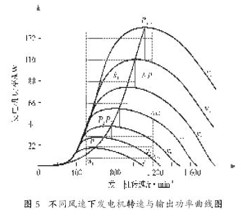 風力機通過葉輪來捕獲流動的風能,風的能量轉化為葉輪旋轉的動能,齒輪箱再把這種機械能傳輸到發(fā)電機,由發(fā)電機通過內部的電磁關系將機械能變?yōu)殡娔茌敵?。圖5為在不同風速下,葉輪轉速與風力機輸出功率的關系圖。由圖可知,對應于每個風速的曲線,都有一個最大輸出功率點,風速越高,輸出功率越高,相應的葉輪轉速也越高。因此,如果能隨風速變化改變葉輪轉速,使得風力機在所有風速下都工作于最大功率輸出點,則發(fā)出電能最多,否則發(fā)電效能將降低。