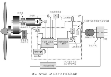 ACS800-67 風力發(fā)電變頻器主要和帶有轉子繞組和滑環(huán)的感應式發(fā)電機一起使用,連接于雙饋發(fā)電機轉子和電網之間,電路圖如圖6所示。該變頻器既可以安裝在塔基處也可以安裝于發(fā)電機艙內。