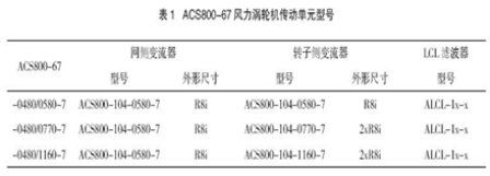 如前所述,雙饋風力發(fā)電系統(tǒng)的變頻器由于接在發(fā)電機的轉子側,所以變頻器容量可小于發(fā)電機的容量,僅為發(fā)電機的轉差功率,因此,變頻器容量的選擇與風力發(fā)電機的調速范圍密切相關。一般風力發(fā)電機的調速范圍為額定轉速的70%~130%,轉差率為±30%,所以變頻器的額定容量可選為發(fā)電機額定容量的1/3。表1為ACS800-67的選型表。