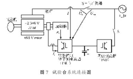 上海南洋電機廠采用ACS800-67 變頻器構建雙饋風力發(fā)電機的實驗平臺,風力機采用直流電動機模擬,即雙饋發(fā)電機轉子靠直流電動機拖動。系統(tǒng)連接示意圖如圖7所示。技術數據如下:發(fā)電機定子額定電壓690 V,定子額定電流1500A,額定頻率50 Hz,額定功率1 345kW,額定轉速1 513 r/min,同步轉速1 500 r/min,功率因數0.9,轉子開路電壓1990V,轉子電流550A;變頻器型號ACS800-67-0480/0770-7,調速范圍±30%。