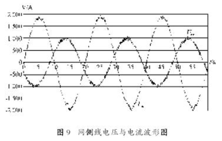 圖9 為發(fā)電機處于超同步運行(轉子轉速為1 513 r/min),給定轉矩為額定轉矩的85%,無功功率給定為零時,電網線電壓、相電流的波形圖。理論分析可知,當發(fā)電機處于超同步運行狀態(tài),發(fā)電機的定子側和轉子側應同時向電網輸出電能,網側相電流為定子與轉子的電流之和。通常網側變流器的無功功率給定設置為零,所以定子與轉子電流的相位相同,都與電網電壓反相。實際上,由圖可知,電網相電壓與定子電流相位相差180°,完全反相,發(fā)電機處于發(fā)電狀態(tài),向電網輸出電能,功率因數為-1。