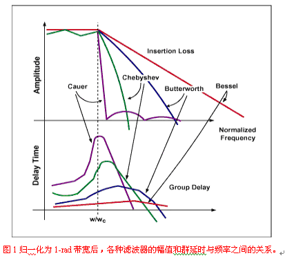 不論是用于抗混疊還是重建,濾波器都必須具備低通特性,使視頻的幀頻能夠通過。因此,設(shè)計者需要謹慎考慮AC耦合。低通濾波器可以根據(jù)其幅度特性或用于描述它的多項式來分類(Bessel、Butterworth、Chebyshev或Cauer)。圖1所示為歸一化為1-rad帶寬后這些濾波器的特性。通常應(yīng)該選取具有最佳選擇性與最小極點數(shù)(降低成本)的濾波器,但是對相位線性度的額外要求限制了可選擇的范圍。