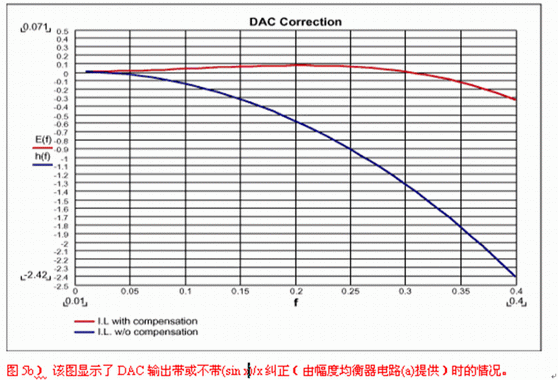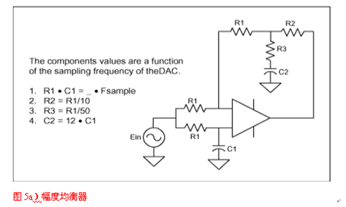DAC之后的重建濾波是沒有被很好理解的應(yīng)用之一。很多設(shè)計者認為引入重建濾波器是為了濾掉采樣時鐘,但這遠不是事實。當信號被采樣時,采樣中包含了多個重復(fù)的信號映像,分別對準采樣時鐘的各次諧波。重建濾波器將濾掉除基帶采樣外的所有其他信號。如果抗混疊濾波器達到了其目的,那么DAC輸出看上去就像圖4中的映像A,接下來,它右邊的所有采樣都應(yīng)被濾掉。因此,對于重建的要求類似于抗混疊,但是,由于每個采樣只停留瞬間,DAC會將每個采樣保持一個時鐘周期,這樣一來,就產(chǎn)生了我們所熟悉的逼近于某斜線的臺階狀波形。保持功能相當于一個數(shù)字濾波器,它的特性類似于Butterworth或Bessel濾波器,在半采樣頻率處響應(yīng)被降低了4dB。重建濾波器的第二個目的是補償這個損失,這就需要如圖5a電路那樣的幅度均衡器。該均衡器在一個延時電路的基礎(chǔ)上構(gòu)成,具有類似于Bessel濾波器的響應(yīng)。它可按照DAC采樣率(FS)來設(shè)計。圖5b顯示了采用和未用幅度均衡器時的DAC頻率響應(yīng)。與延時級類似,它可以被包含在任何重建濾波器中。