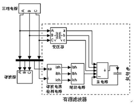 該有源濾波器主要由諧波電流檢測電路、驅動電路、主電路、電容器和變壓器5大部分組成。變壓器的設置主要是為調(diào)節(jié)有源電力濾波器交流側電壓之用。其原理如圖1所示。其中的諧波源模塊是根據(jù)主提升機房實際諧波測試數(shù)據(jù)建成的。