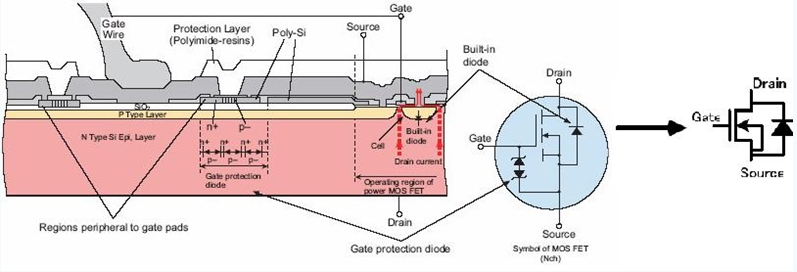 在MOS管原理圖上可以看到,漏極和源極之間有一個(gè)寄生二極管。這個(gè)叫體二極管,在驅(qū)動(dòng)感性負(fù)載(如馬達(dá)),這個(gè)二極管很重要。順便說(shuō)一句,體二極管只在單個(gè)的MOS管中存在,在集成電路芯片內(nèi)部通常是沒(méi)有的。下圖是MOS管的構(gòu)造圖,通常的原理圖中都畫(huà)成右圖所示的樣子。 (柵極保護(hù)用二極管有時(shí)不畫(huà))