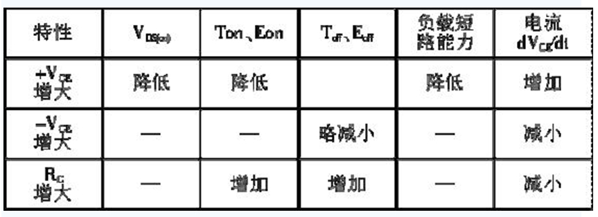 IGBT 的驅動條件與它的靜態(tài)和動態(tài)特性密切相關。柵極的正偏壓+VGE、負偏壓-VGE 和柵極電阻RG 的大小,對IGBT 的通態(tài)電壓、開關時間、開關損耗、承受短路能力以及dVCE/dt等參數都有不同程度的影響。門極驅動條件與器件特性的關系如表1 所示。