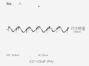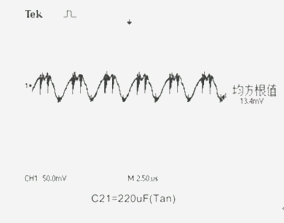 電路中電壓輸入端C6.7.8接入PA-Cap 6.3V/22μF。在輸出端C20.21位置分別接上鉭電解電容器:10V/470μF、16V/220μF和PA-Cap聚合物電容器:10V/22μF、4V/82μF作為濾波電容器,用示波器測(cè)量電路的輸出紋波電壓Vr。