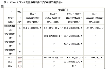例如一個(gè)輸出功率為30kW的變頻器,整流濾波電容器可以采用四只3300μF/400V電解電容器兩串兩并實(shí)現(xiàn)。以通常認(rèn)為性能很好的日立變頻器用HCGF5A的電解電容器為例:40℃時(shí)的額定紋波電流為22.2A,而在85℃按日立公司的折算方法,對(duì)應(yīng)額定紋波電流將降低到8.2A,兩只并聯(lián)也不過是16.4A。不僅如此,壽命也僅能在85℃溫度下保證2000小時(shí)。而整流器的紋波電流就是接近60A!,加上逆變器的60A紋波電流,電解電容器間處于什么狀態(tài)?這兩個(gè)紋波電流即使按均方根值計(jì)算也將達(dá)到85A以上,是40℃下的額定電流的近4倍!這時(shí)的濾波電容器的壽命將會(huì)怎樣呢?