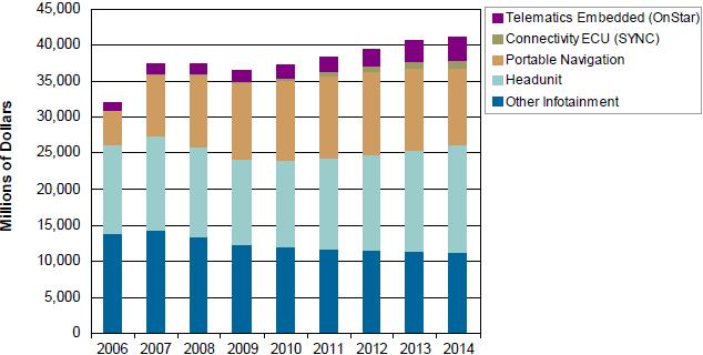 圖1所示為iSuppli公司關(guān)于2006-2014年全球汽車信息娛樂系統(tǒng)銷售額的預(yù)測。