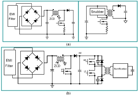 如前所述,一旦功率大于75 W,除了滿足上述工作能效及空載能耗要求外,電路中還面臨著加入PFC的要求,這在改善功率因數(shù)、使電網(wǎng)電能得到更高效利用的同時(shí),也會(huì)使得電路結(jié)構(gòu)更為復(fù)雜。在這類(lèi)應(yīng)用中,傳統(tǒng)電源架構(gòu)是PFC+PWM的兩段式架構(gòu),即在非連續(xù)導(dǎo)電模式(DCM)或臨界導(dǎo)電模式(CrM)段后跟隨著準(zhǔn)諧振反激段,每個(gè)段都使用一個(gè)控制器,如圖2(a)所示。