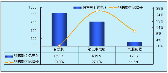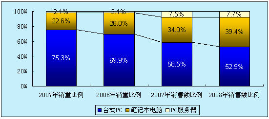 2009年中國IT市場年會上賽迪顧問發(fā)布的最新研究成果顯示,2008年,包括臺式PC、筆記本電腦和PC服務(wù)器在內(nèi)的PCs市場銷量達(dá)到3218.5萬臺,同比增長15.2%,銷售額為1612.4億元,同比增長9.6%,增速相比上一年都有較大的下滑。其中,臺式PC與預(yù)期相比下降最大。