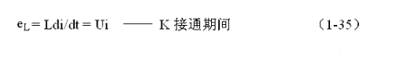 式中Ton為控制開關(guān)K接通的時間。當(dāng)圖1-11-a中的控制開關(guān)K由接通狀態(tài)突然轉(zhuǎn)為關(guān)斷時,儲能電感L會把其存儲的能量(磁能)通過反電動勢進行釋放,儲能電感L產(chǎn)生的反電動勢為: