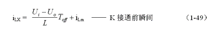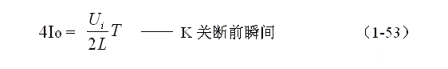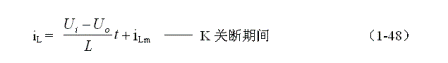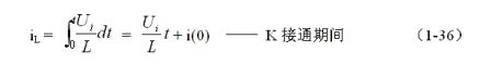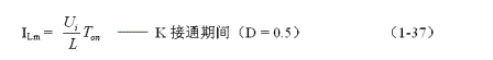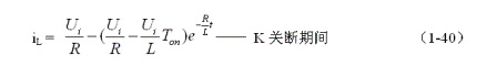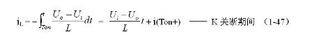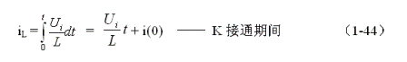 (1-44)式中iL為流過儲能電感L電流的瞬時值,t為時間變量;i(0)為的初始電流,即:控制開關(guān)K接通瞬間之前,流過儲能電感L中的電流。當(dāng)開關(guān)電源工作于臨界連續(xù)電流狀態(tài)時,i(0) = 0 ,由此可以求得流過儲能電感L的最大電流為: