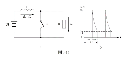 圖1-11-a是并聯(lián)式開關(guān)電源的最簡單工作原理圖,圖1-11-b是并聯(lián)式開關(guān)電源輸出電壓的波形。圖1-11-a中Ui是開關(guān)電源的工作電壓,L是儲能電感,K是控制開關(guān),R是負載。圖1-11-b中Ui是開關(guān)電源的輸入電壓,Uo是開關(guān)電源輸出的電壓,Up是開關(guān)電源輸出的峰值電壓,Ua是開關(guān)電源輸出的平均電壓。