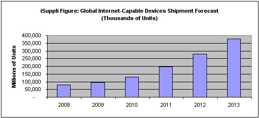 下圖為iSuppli對(duì)互聯(lián)網(wǎng)設(shè)備2008年至2013年期間全球出貨量的預(yù)測(cè)。