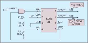 需要指出的是,MAX708本身可以監(jiān)控VCC電壓(這里為5V),這對電路采用多電源模塊的設(shè)計(jì)是很有用的。因?yàn)閮蓚€(gè)電源模塊相互獨(dú)立,5V和1.5V可能不是源于同一個(gè)電源模塊,所以在監(jiān)控1.5V的同時(shí)也需要監(jiān)控5V電壓。