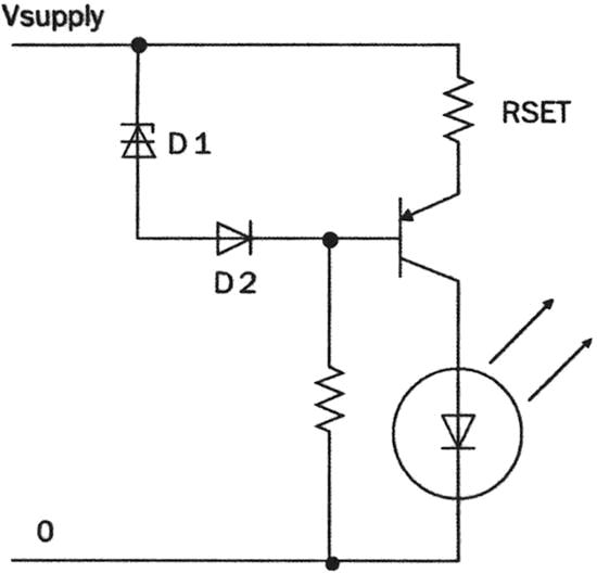 相對(duì)簡(jiǎn)單的方案是使用線性降壓穩(wěn)壓器(圖1),D1是一個(gè)穩(wěn)壓二極管,通過(guò)LED的電流設(shè)定為VD1/RSET。D2對(duì)基極二極管進(jìn)行濕度補(bǔ)償。這個(gè)電路仍然存在能量損失問(wèn)題和電阻散熱問(wèn)題。對(duì)于低電流LED,尤其是串聯(lián)后的LED正向壓降和稍低于電源電壓的場(chǎng)合,這個(gè)電路不失為經(jīng)濟(jì)有效的方案。