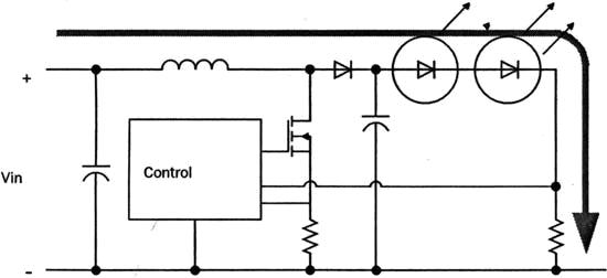這個(gè)值由可編程IC或外部元件來(lái)設(shè)定。電流值也由FET開關(guān)漏極上檢測(cè)電阻來(lái)定義。降壓穩(wěn)壓器流過(guò)LED的電流是連續(xù)的,但是交變的,而對(duì)電源而言是不連續(xù)的,這對(duì)電源工作會(huì)產(chǎn)生一定的影響,也增加了電源線上的噪聲。